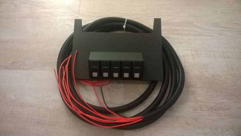 5 Carling spínačů na panelu pod středovou konzolou. Zapojeno na pět relé umístěných v krabici v motorovém prostoru (včetně zdroje na USB) a nevypadá to vůbec špatně a funguje to náramně. BTW: tlačítka opatřeny pojistkou proti nechtěnému sepnutí. :wink: