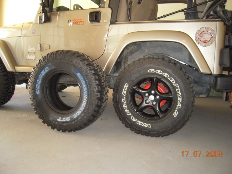 Chci na Wraníka nové obutí. Mám TJ 4,0l 130kW 5-ti kvalt manuál, lift 2palce, disky 15" s ET 0